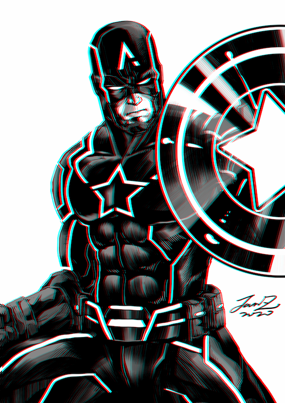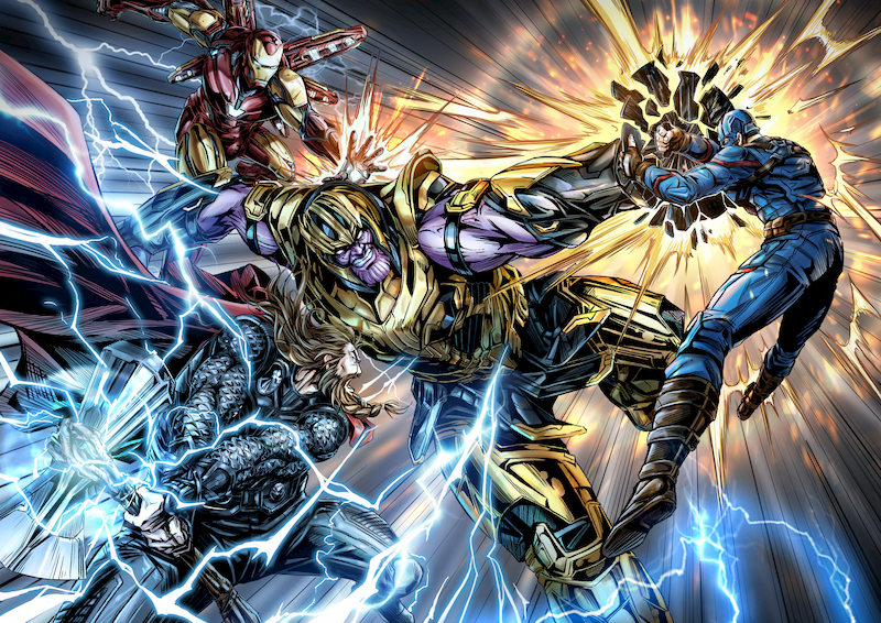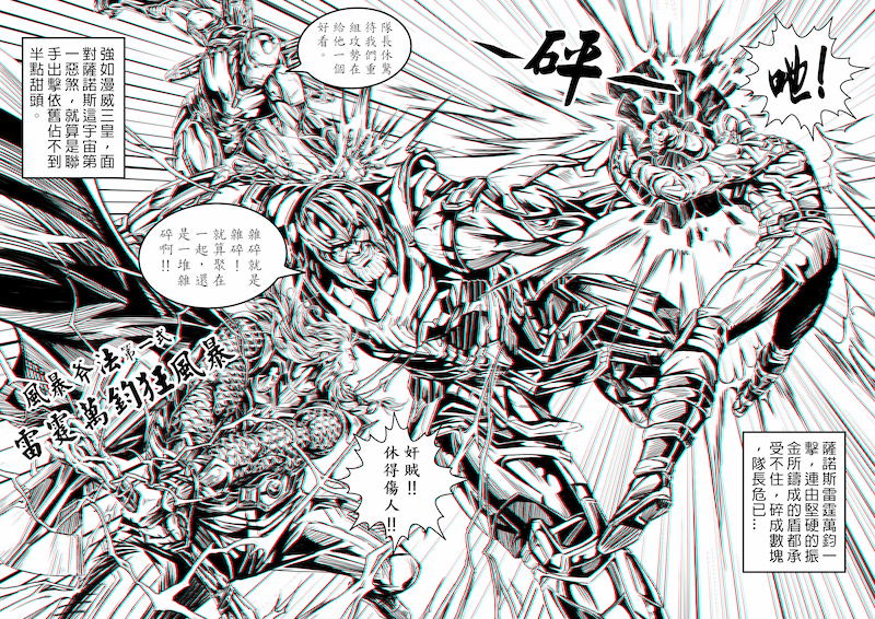 而這幅畫裡藝術家大膽將漫威電影終局之戰中的經典打鬥畫面為底,再加上港漫中喜歡使用大量旁白、招式名稱來協助說明畫面的方式,此種令人相當耳目一新的做法,再加上整體於肢體動作、畫面構圖上的巧思,無疑就是經典漫畫中的一頁高潮戲碼。在港漫中,招式名稱的出現通常會附上是系列中的第幾式,如此一來也能以此得知招式強弱,來推估敵人的實力等級與畫面中各個角色在強度上的關係。加上藝術家本身擅長以「透視」的技巧來製造不同的遠近感,使得整張打鬥的畫面不會看起來在同一個平面上而顯得過於單薄。