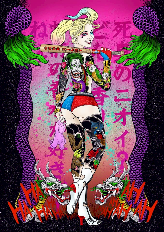 從作品中小丑女身上充滿了日本式的傳統刺青,藝術家想表現出這些刺青對於哈莉本身的守護,尤其是將自己一生摯愛-小丑,刺在自己全身面積最大的背部上,以日式傳統的「般若」來做為構圖基礎,加上由布魯斯提姆繪製的小丑其胸前「牡丹花」造型的硫酸花武器,來象徵80年代的經典小丑造型,表現對他的愛一直在自己心中極大的份量。