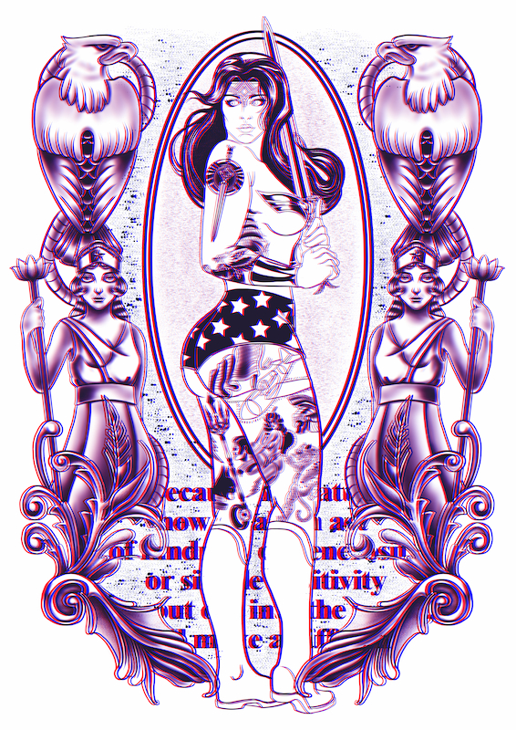 以出身於神秘島嶼-天堂島的神力女超人為主體,體現宛如東方傳統的海上守護神-媽祖那樣庇佑每一位與大海拚搏的海上男兒。以右手臂上大大的寶劍與圓盾組合而成的羅盤圖樣,為在海上奮戰的水手們指引正確的航道,而同時為美國象徵的神力女超人護腕旁的老鷹、右腿上的星條旗和隱形戰機,每一樣都為這幅作品注入滿滿的美國精神。順著腿部線條往下看到身為反派的戰神阿瑞斯與豹女,破除這些威脅正是她所被賦予的使命。