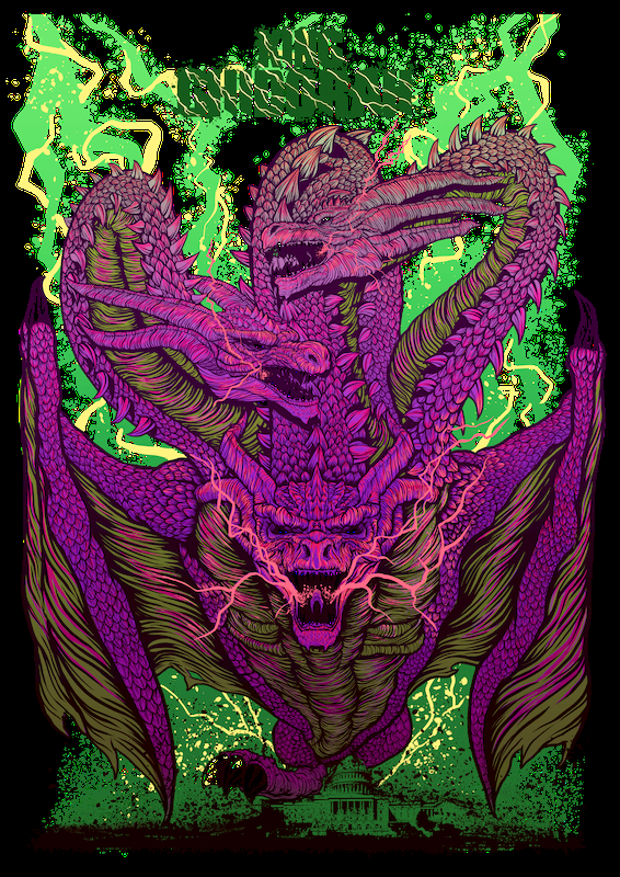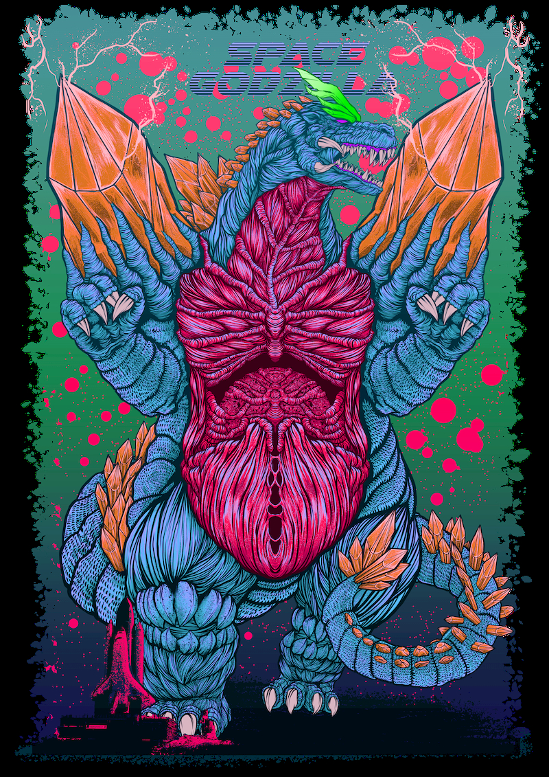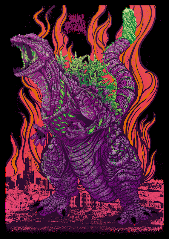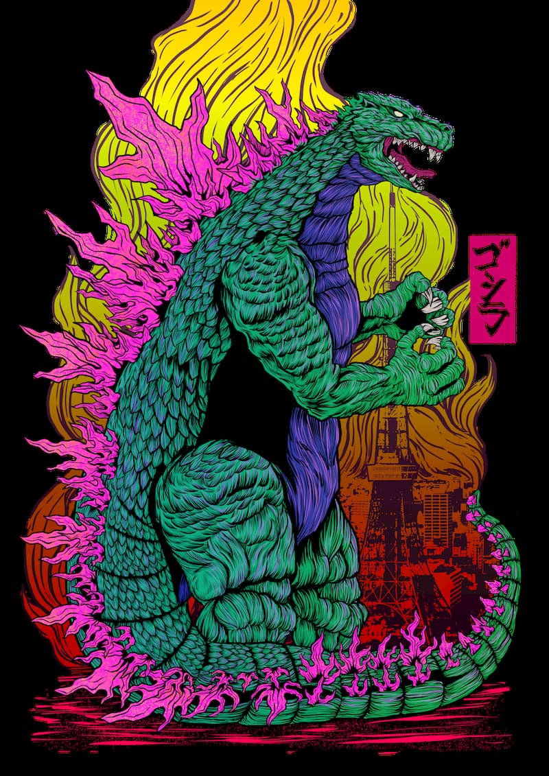 其構圖靈感來自於藝術家本身喜愛的一款80年代玩具-《魔髮精靈》(Trolls),這是一個充滿炫麗色彩的電影,從這張圖上色的多樣性便可略知一二,而在哥吉拉背後的巨大火焰,表層的意義是哥吉拉反撲、破壞時引起大火,將世界摧毀殆盡。不過你有發現嗎?這把火焰線條本身的流動方式宛如髮絲一般,這其實就是呼應「魔髮精靈」中以頭髮為核心的設計,而整張圖片的配色上也參考電影中擁有彩虹般五顏六色的形式,讓整張作品更加生動。