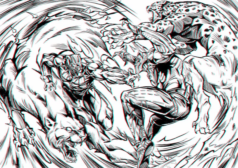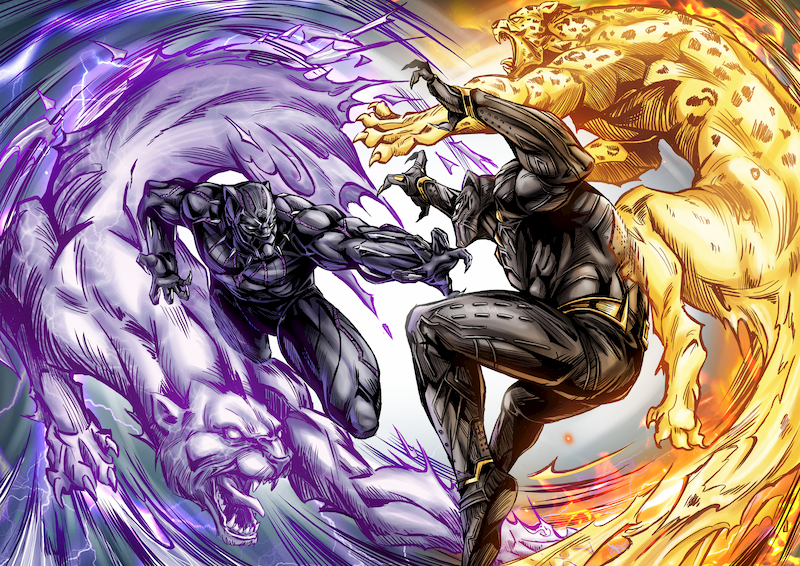 在MCU的宇宙中最能代表動物的英雄角色非「黑豹」莫屬,藝術家以【黑豹】電影中帝查拉大戰齊爾蒙格的經典抗衡場面,來表現赤手空拳的熱血澎湃感。再來看到構圖上,這巧思在於雖然兩個人物置於整個畫面第一眼吸引眼球的位置,但因為右上與左下兩個角落的動物比起他們更顯得有戰鬥的張力,進而讓欣賞的目光停留得久一些,這也是藝術家本身希望做到的效果。也就是說整個畫面上視覺的分配及暫留仍會以英雄背後的動物為主,反而巧妙地以英雄來襯托出兩隻猛獸的野性與氣勢。